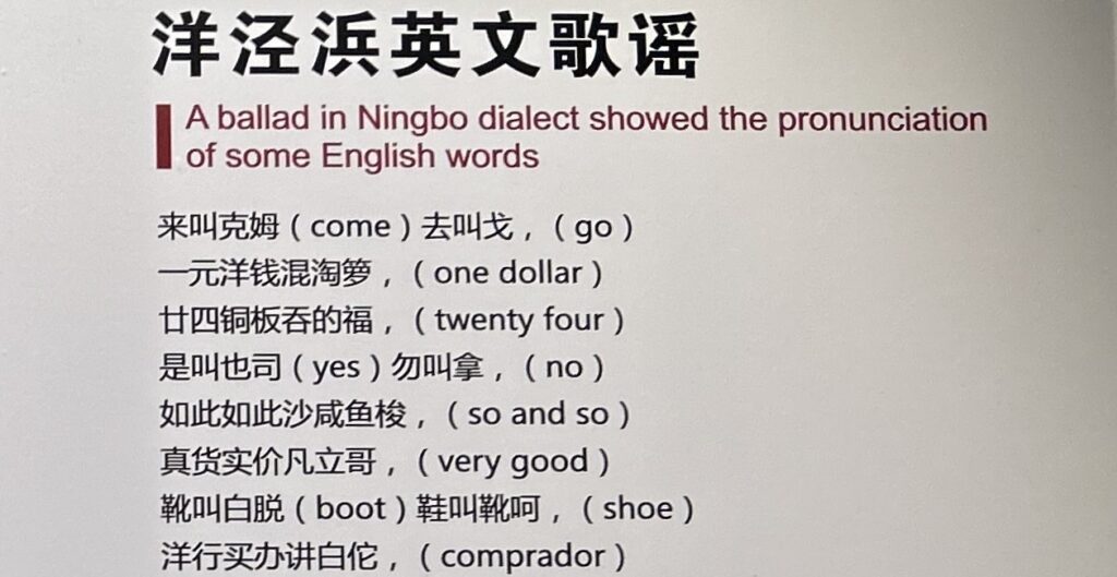 Moreover, many Ningbo merchants had already gone to Shanghai to seek new opportunities such as acting as compradores or linguists before Shanghai was officially opened as a treaty port. 穆炳元 (Mu Bingyuan) of Dinghai, Zhaoshan city was the first compradore in Shanghai and allegedly the author of the Pidgin English ballad above. 王槐山 (Wang Huaishan) of Yuyao was the first compradore of Hongkong and Shanghai Banking Corperation in Shanghai. So, while Shanghai was thriving and became the “Paris of the Orient”, Ningbo in 1854 was ‘the quietest place under the sun. A handful of merchants lived there, buried without the trouble of dying; one or two consulates had been built, but roads were non-existent, and the few houses were separated from one another by a network of paddy (rice) fields.” (Bredon 1909).2 So, “go Ningpo more far” was an evasive way to indicate that someone disappeared in some faraway places and was unlikely to return.